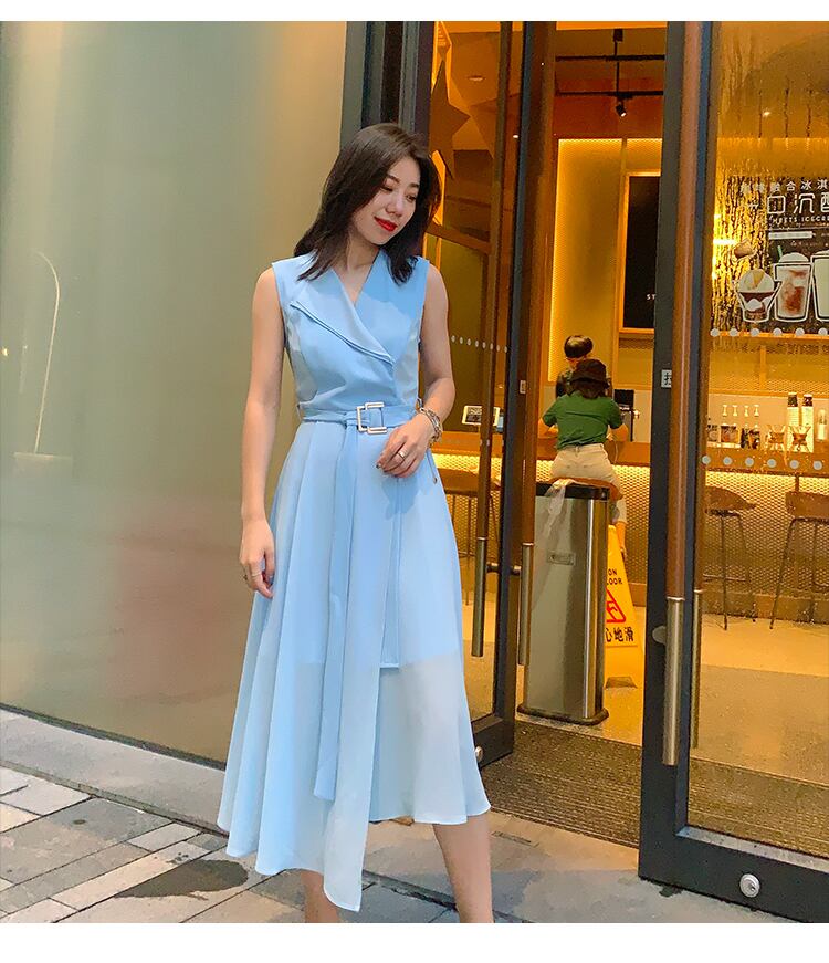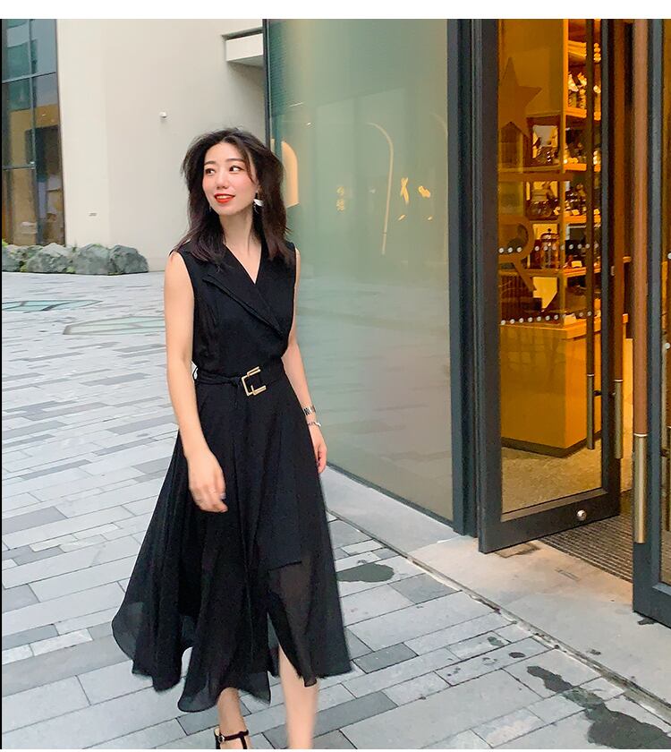 X-10240 ロング丈 ベルト ブラック シフォン シースルー Vネック ノースリーブ フレア 夏 パーティー お呼ばれ 上品 大人