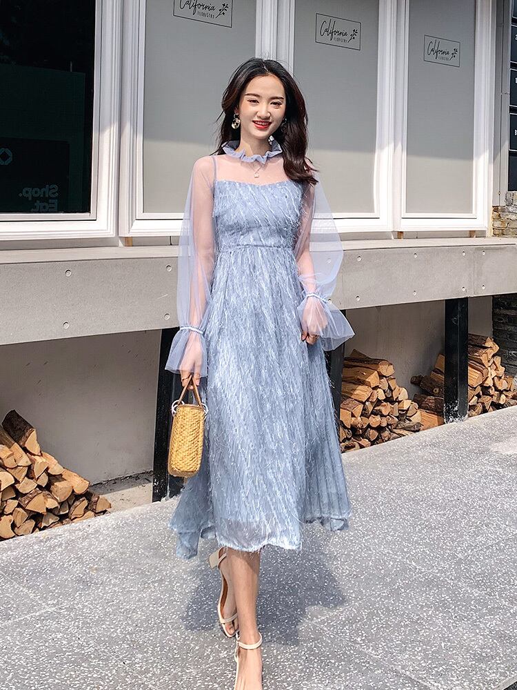 X-10299 フレア フリル 2色 シースルー チュール ミモレ丈 フェザー 長袖 夏 秋 春 秋 ハイネック パーティー 結婚式 お呼ばれ エレガント 可愛い