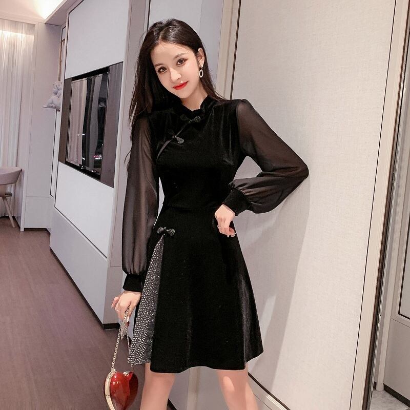 H1232 チャイナ パーティ ミニドレス レース ベロア ミニ丈 長袖 ブラック 結婚式 二次会